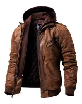 FLAVOR Men Brown Leather Motorcycle Jacket with Removable Hood